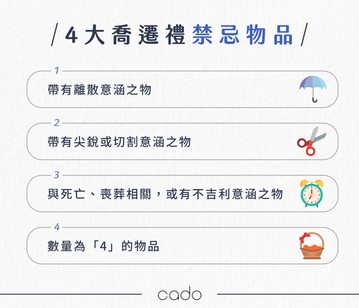 實用的喬遷禮固然重要,但有些禮物可能會因為諧音或象徵意義而被視為不吉利,送了反而會讓人感到尷尬,甚至與對方產生誤會,以下整理了 4 大類常見的入厝送禮禁忌物品,若有離散、切割、死亡、不吉祥的隱喻都要留意,以防好心送禮卻造成反效果!
